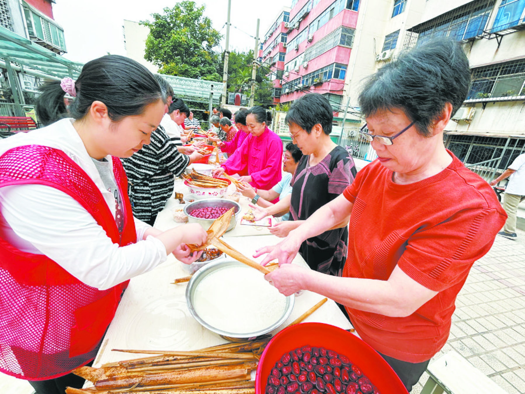 黨員志愿者和居民一起包粽子。