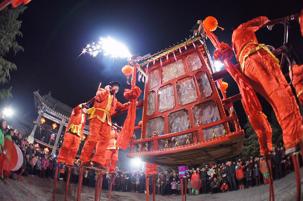 焦作沁陽市山王莊鎮萬南村的大型民間集體舞蹈藝術“高抬火轎”起源于宋代,明末清初得到發展。當地居民自古以來就有踩高蹺、抬花轎鬧新春的習俗。明萬歷年間,大科學家和藝術家、明鄭藩王子朱載堉把踩高蹺和抬花轎兩種民間表演藝術結合在一起,設計出了踩著高蹺抬花轎的表演形式。隨后,朱載堉不斷對其進行改進,將白天表演改為夜間表演,將花轎改為火轎,把原來的布轎改為紗轎,轎的周圍插上蠟燭,轎頂鑲嵌著能噴射彩色火焰的龍頭,寓意火旺、財旺,象征著一年里百姓生活紅紅火火。