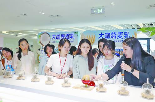 在大咖國際食品有限公司,令黃啟鳴印象最深刻的是參觀蜜雪集團·大咖國際茶飲夢工廠。“通過這里新穎的沉浸式體驗模式,我不僅全程見證了一杯奶茶誕生的過程,而且詳細了解了該企業高質量發展的思路和‘以奮斗者為本,以顧客為中心’的經營理念,掌握了許多書本上學不到的知識。”黃啟鳴說。