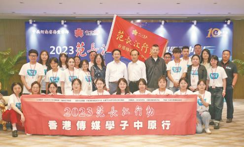 6月25日下午,主題為“行走河南、讀懂中國”2023范長江行動——香港傳媒學子中原行在河南鄭州啟動,與會領導與采訪團成員合影。