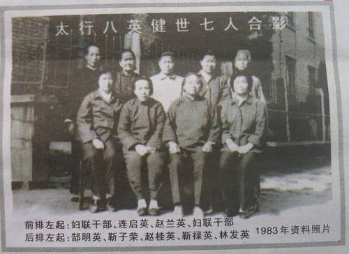 1983年,“八英”健世七人合影(前排左起:婦聯干部、連啟英、趙蘭英、婦聯干部;后排左起:郜明英、靳子榮、趙桂英、靳祿英、林發英)。